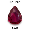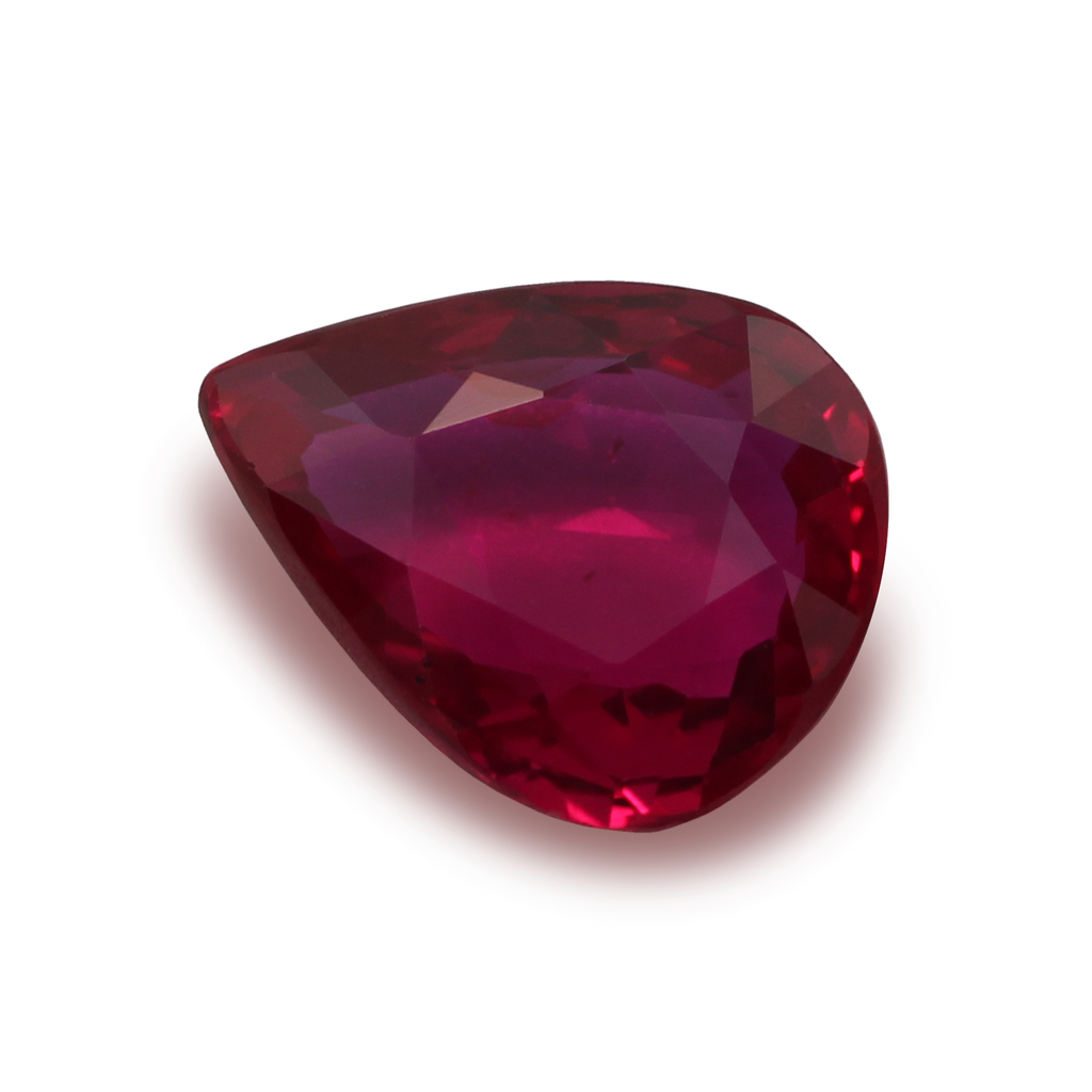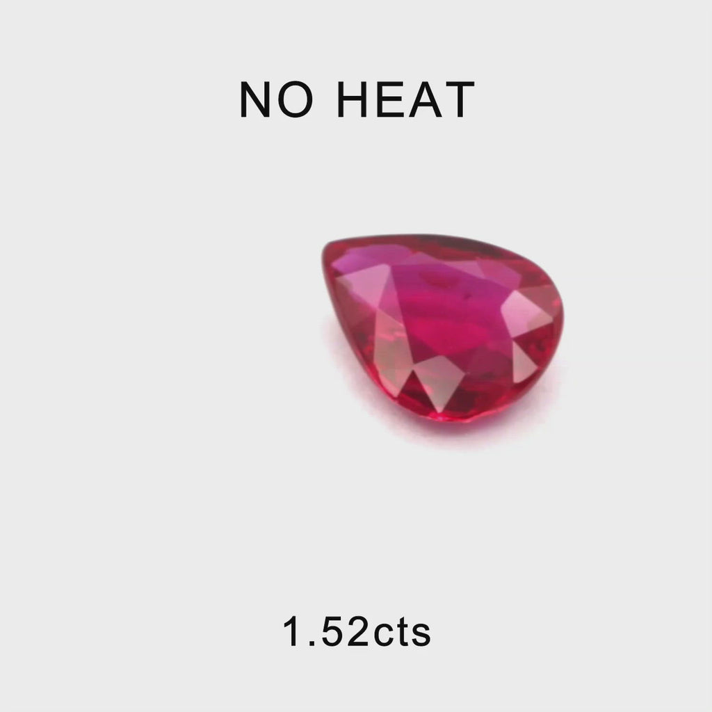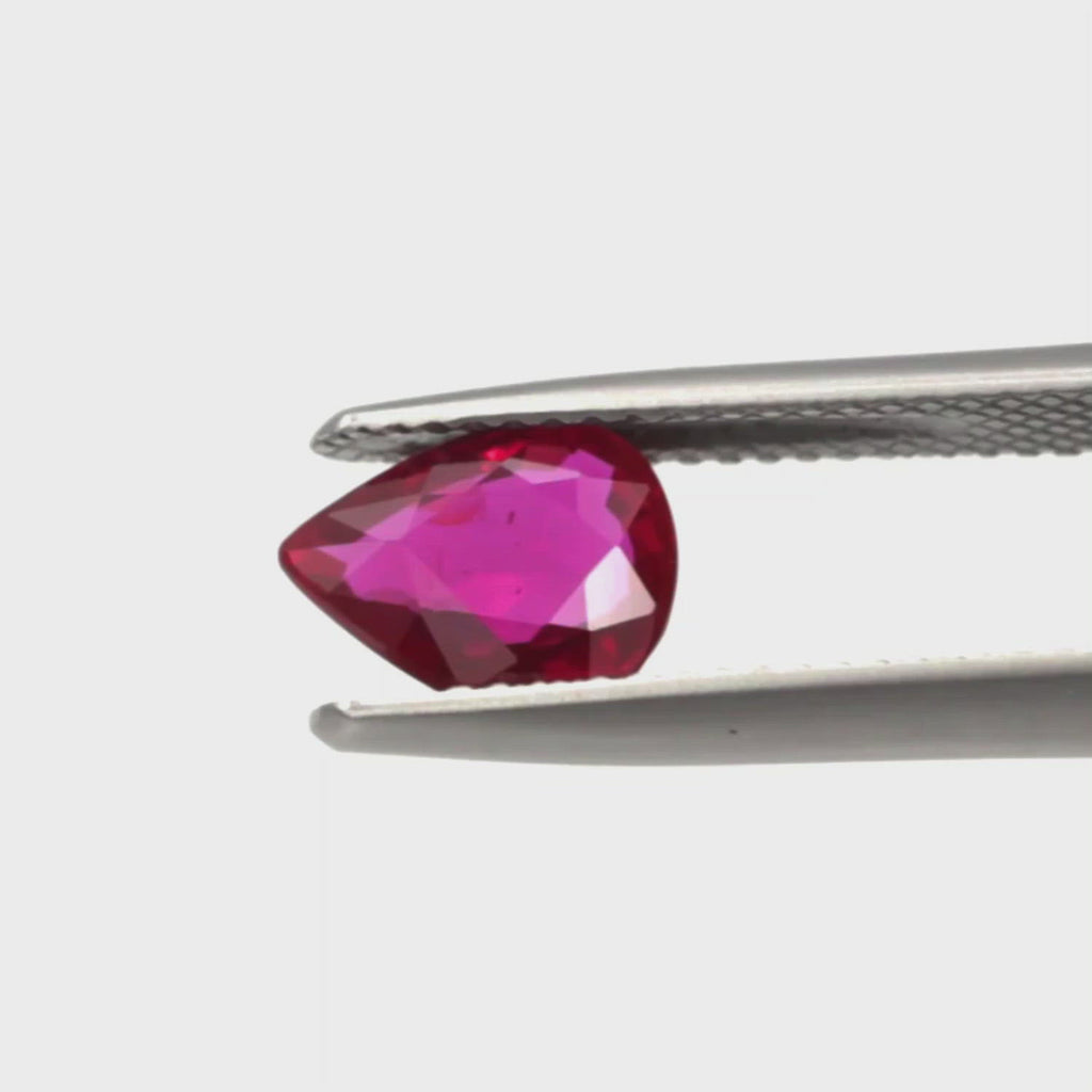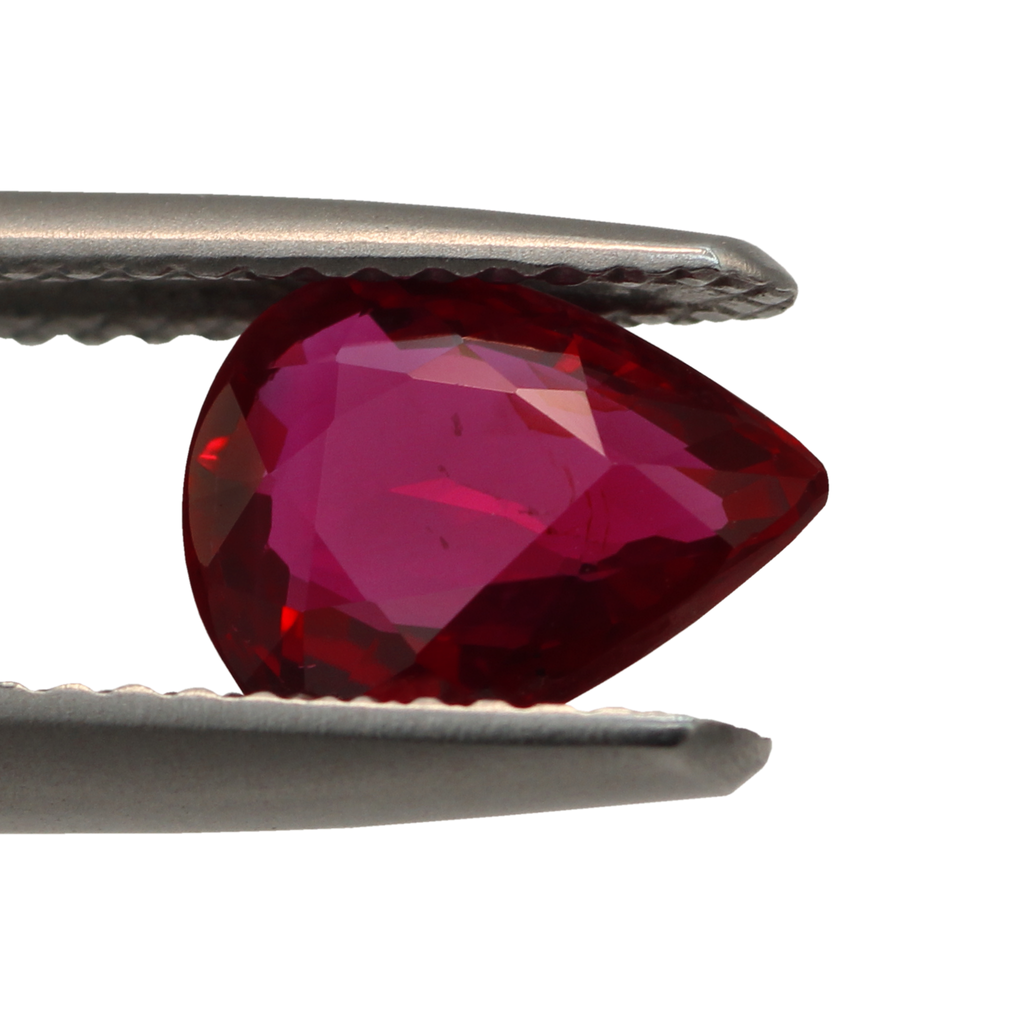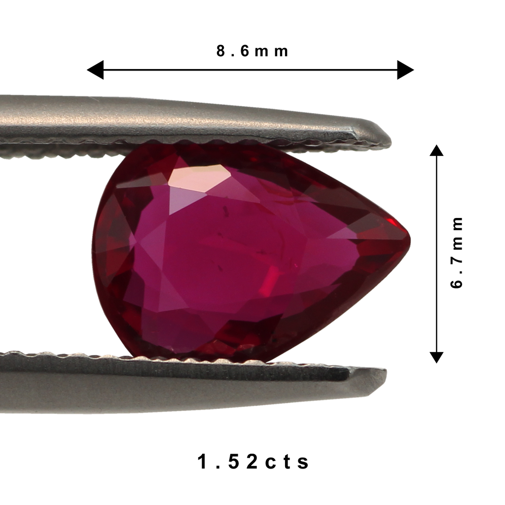 A natural unheated Ruby Pear-cut stone. This stone has a strong fire, proportional shape, and is Eye Clean with an excellent luster. The colour is a brilliant red with a touch of pink.