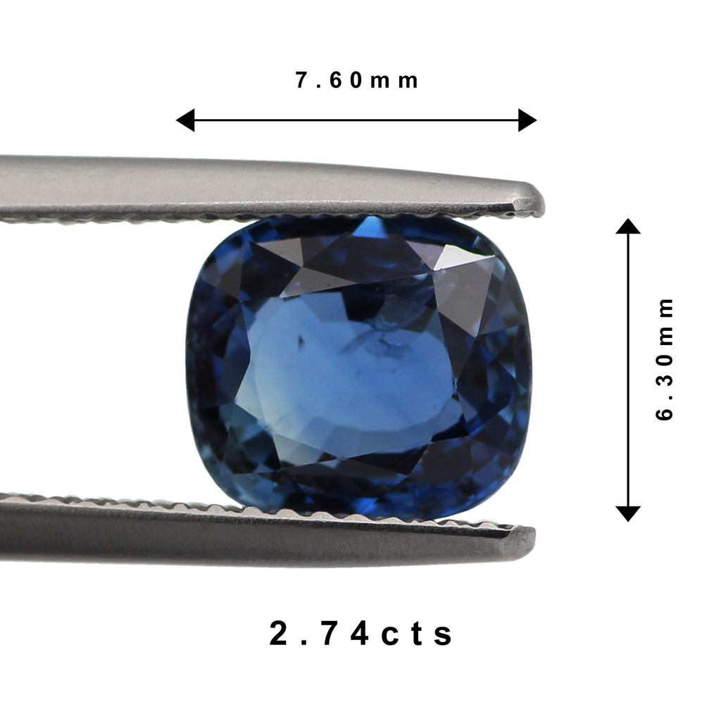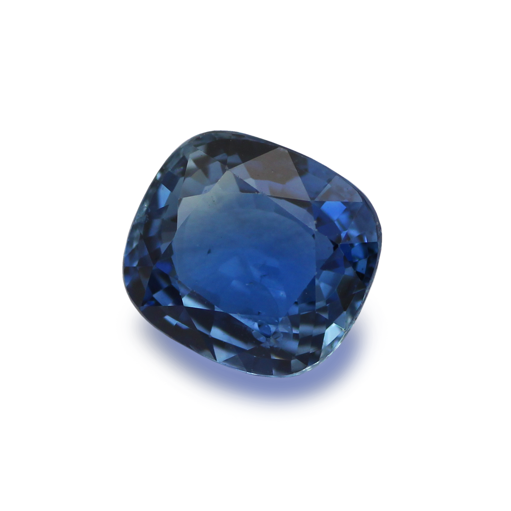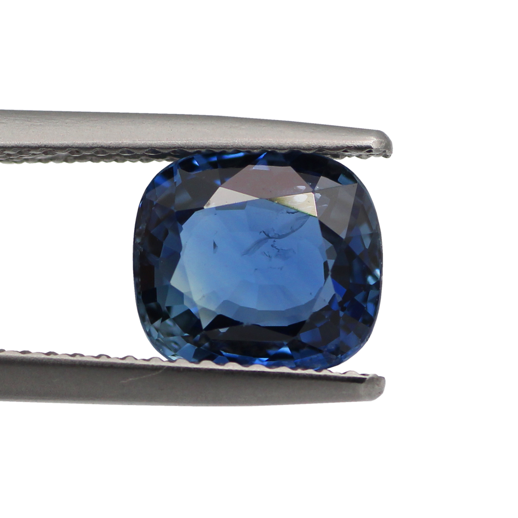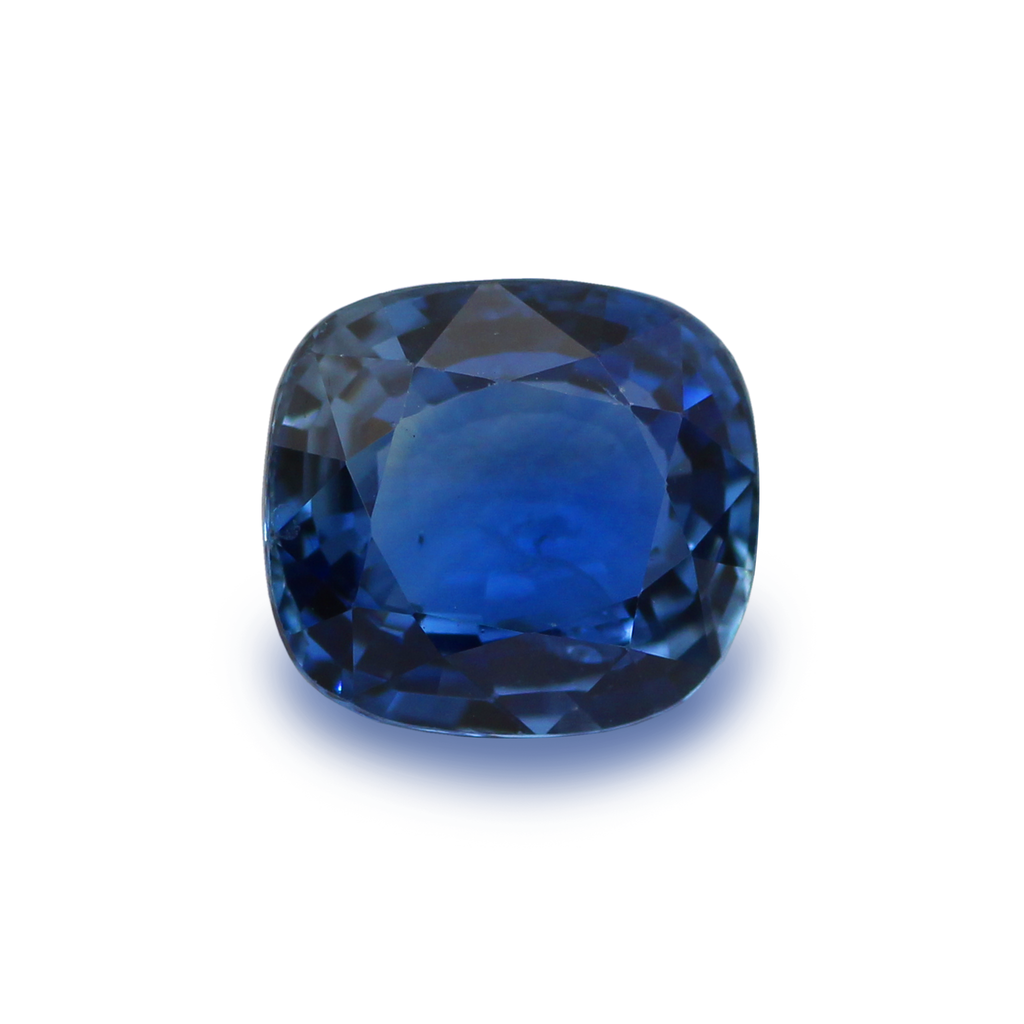 A Natural Sapphire Heated Cushion. This stone has excellent fire and a deep soft blue colour. It slightly includes, but has a strong luster with a desirable proportional face