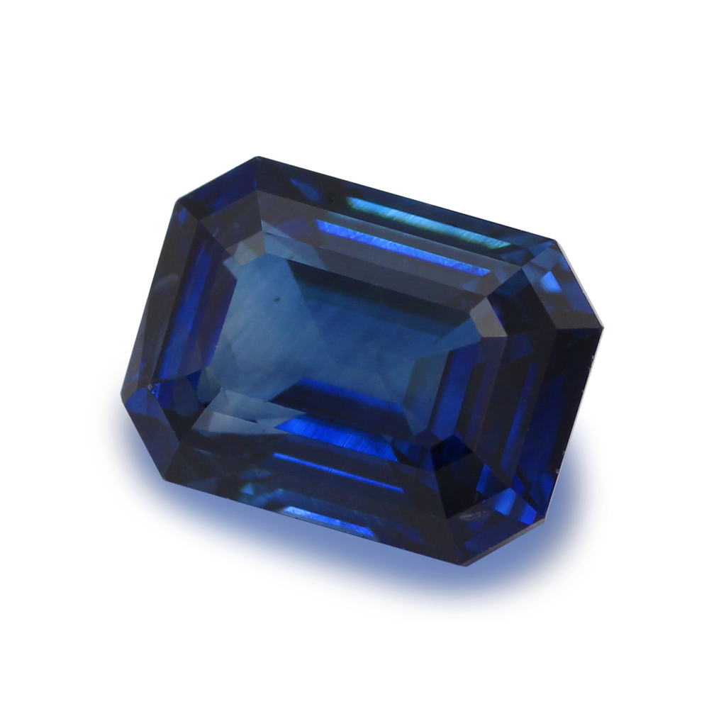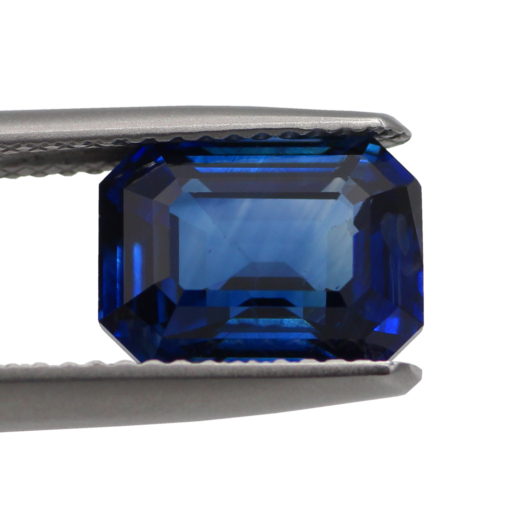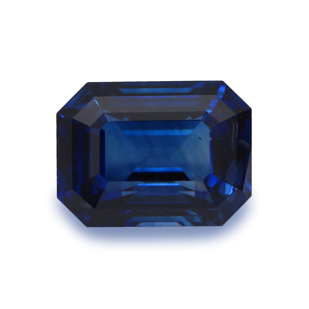 A Natural Royal Blue Sapphire HeatedEmerald Cut. This stone has a strong fire and a dark blue colour. It is slightly included but the face and shape are proportional making it visually appealing.