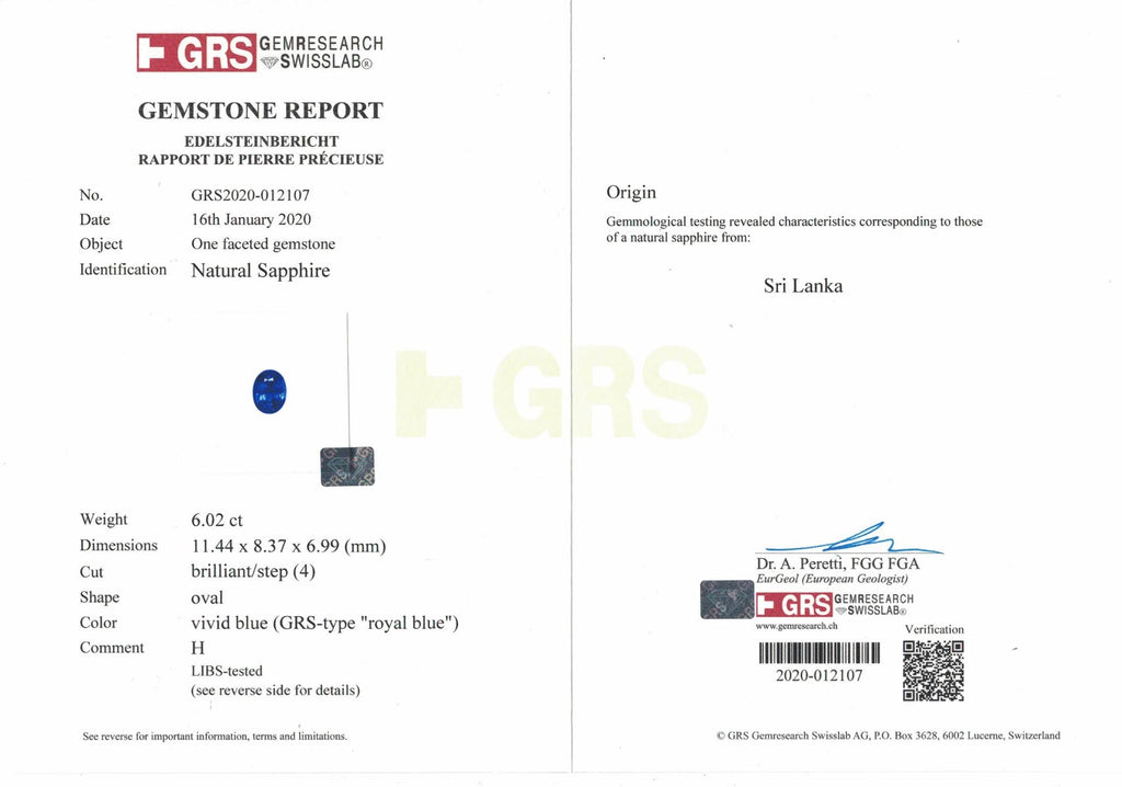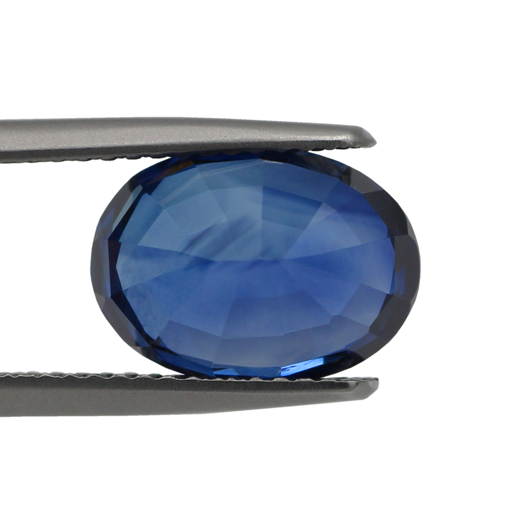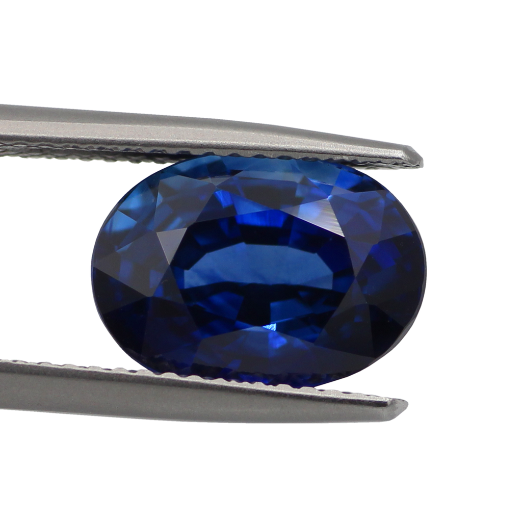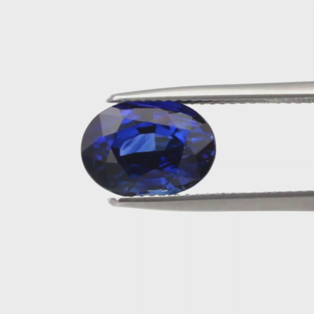 A Natural Royal Blue Sapphire Heated Oval. This stone has a strong luster, a sharp fire and is Eye Clean. The shape and cutting are proportional with slight colour zoning in the stone. The colour is certified as Royal Blue.