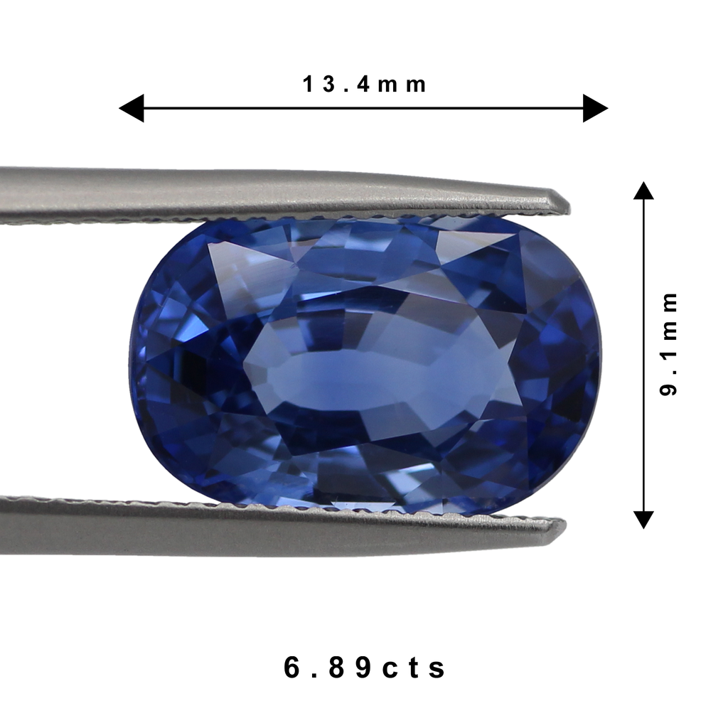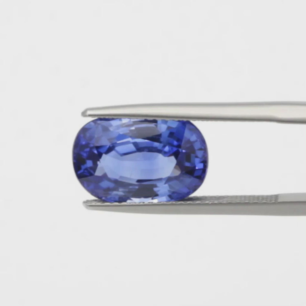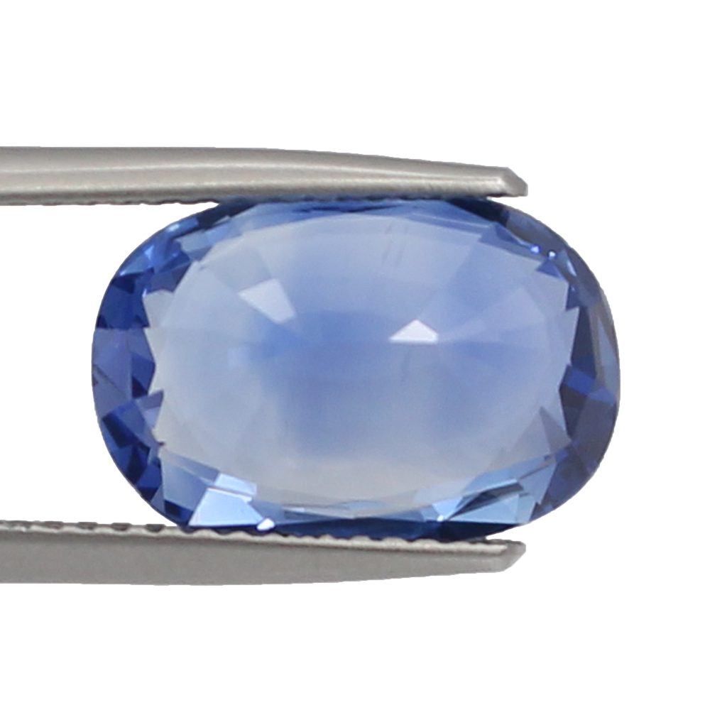 A Natural Heated Blue Sapphire Oval with a soft blue shade and a crisp fire. This stone has a very slight eye visible inclusion on the star facet, has a strong luster and a long face.
